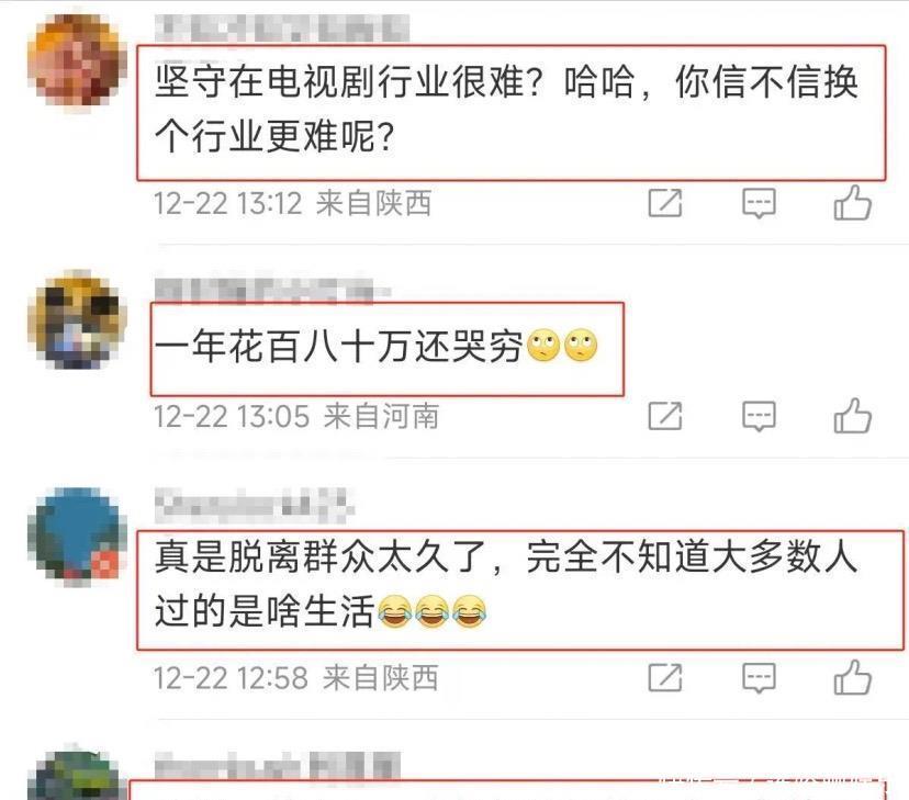 一年花百八十万还哭穷,真的是脱离群众太久了,像是完全不知道大多数人过得什么生活。再者说了,他们一件衣服、一个包,就能抵普通人一年的工资。坚守电视行业很艰难?那么其他行业就更难了。