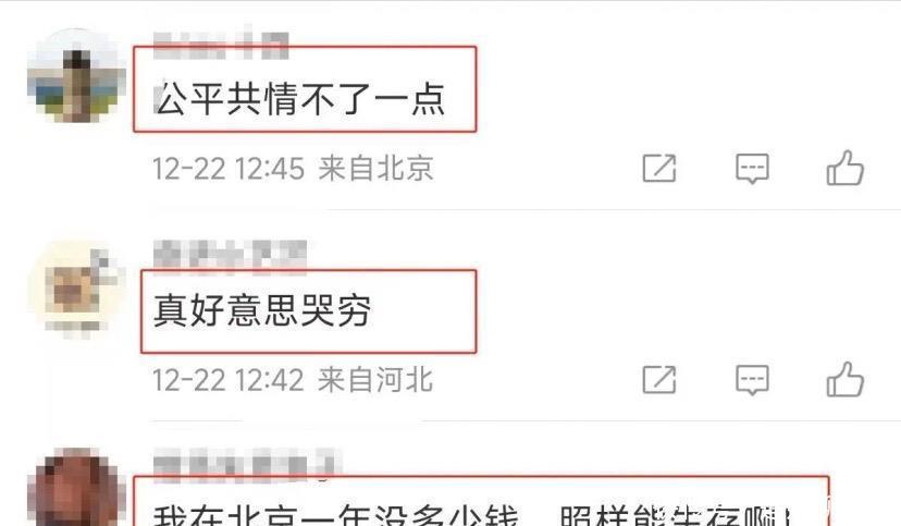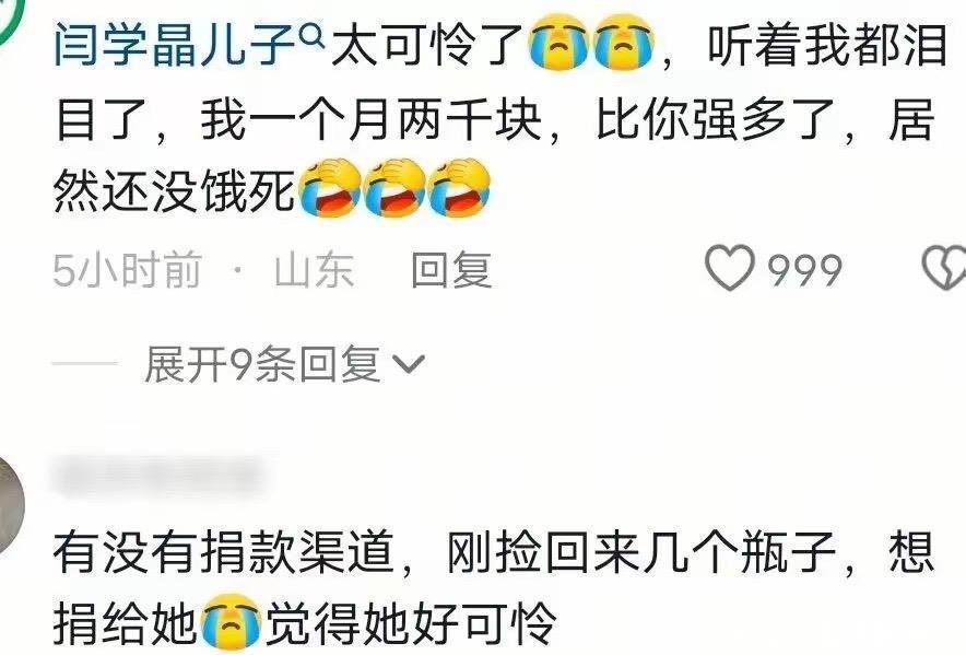 还有一些网友非常热情,觉得闫学晶儿子太可怜了,听得都流泪了。而自己一个月一两千块,比你强多了还没饿死。甚至有人问,有没有捐款渠道,刚捡回来几个瓶子,想捐给她、她好可怜。这嘲讽的语言,真是让闫学晶的好人缘都丢了。